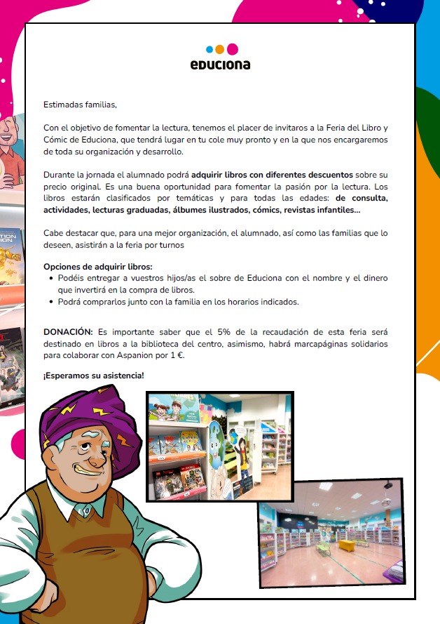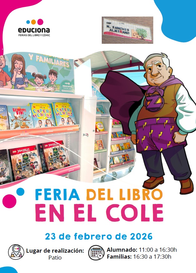 Como asociación nos marcamos el objetivo de ir renovando los libros de la biblioteca y la organización de la feria del libro junto con EDUCIONA, es una magnífica forma de fomentar la lectura y recaudar para ir aportando cada curso nuevos libros a la biblioteca. Estos libros son elegidos por los docentes del centro que seleccionan libros para todas las edades y de diferentes temáticas.